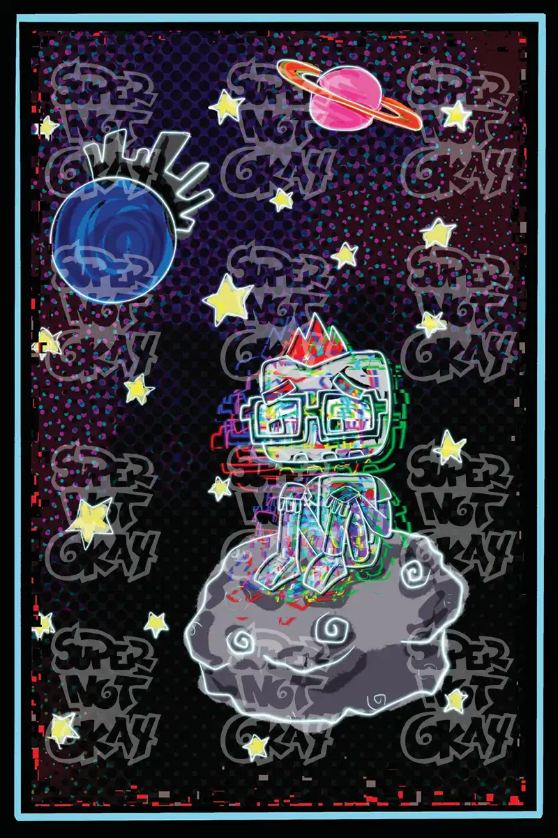 Print of original Super Not Okay artwork from the Sticky Wires Projex, featuring SNO the robot floating through space on a small meteoroid.